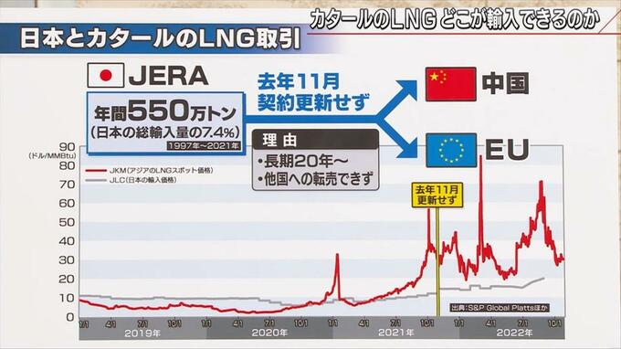 さらに価格の面でも疑問はあった。日本の平均購入価格は、スポット購入額より高めだったが、去年の夏以降LNG価格が高騰。契約更新の11月には、スポット価格が何倍にも跳ね上がっていた。