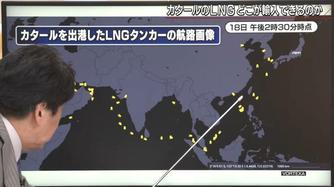 天然ガスはパイプラインで送る場合を除いて、マイナス162度で液化して輸送する。この液化天然ガス(LNG)を、産出国カタールで積んだタンカーが、どこに移動したか映し出した航路画像がある。カタールを出たタンカーの一部は、紅海を通ってヨーロッパへ・・・。別の一部はインド洋を通ってアジア諸国へ向かう。が、日本に向かう船は殆ど無い。このタンカーの航路を調査している、シンガポールのエネルギー調査会社に話を聞いた。