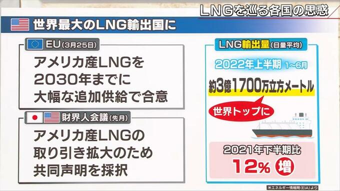 アメリカだ。アメリカは天然ガスの生産量は世界一だが、輸出量は大きくなかった。ところが今回のエネルギー危機によって、今年上半期の輸出量は実に約3億1700万立方メートル。これは世界一の数字だ。つまりアメリカは世界最大のLNG輸出国となった。