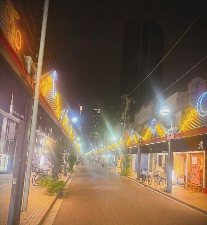 周辺の夜景も写されており、ネオンの看板が彩る賑やかな月島の街並みの中に、静かな通りが続いている様子が写っています。