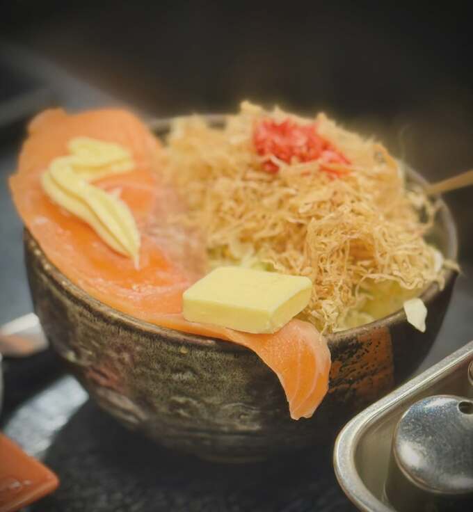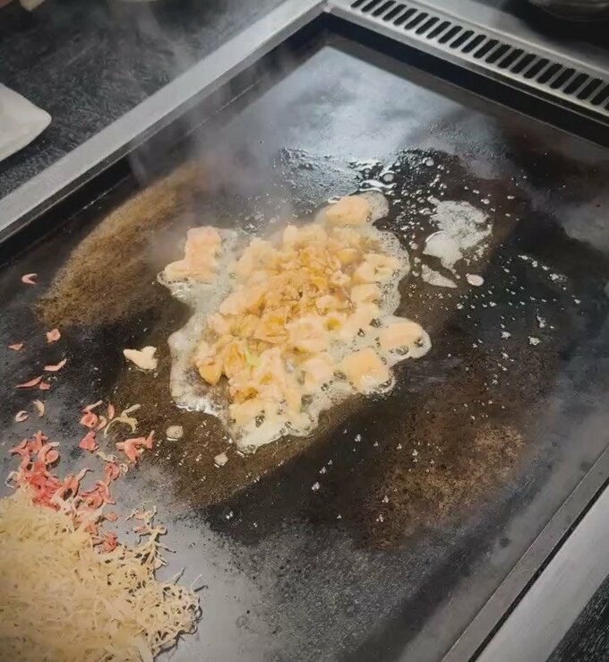 投稿には、熱々の鉄板の上で調理されるもんじゃ焼きの様子が写されています。鉄板の中央に具材が盛られ、周囲には溶けたバターが見えます。また、紅しょうがや麺なども添えられており、湯気が立ち上る様子から、出来立ての熱々の状態であることが伝わってきます。