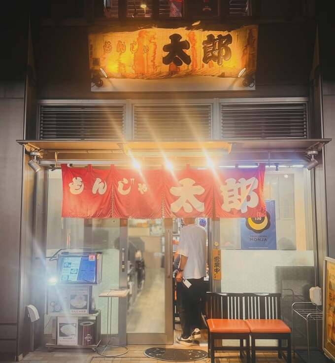 お店の様子も投稿されており、「もんじや 太郎」という赤いのれんがかかった店舗の入り口が写っています。暖かい明かりに照らされた店内の雰囲気が感じられる一枚です。