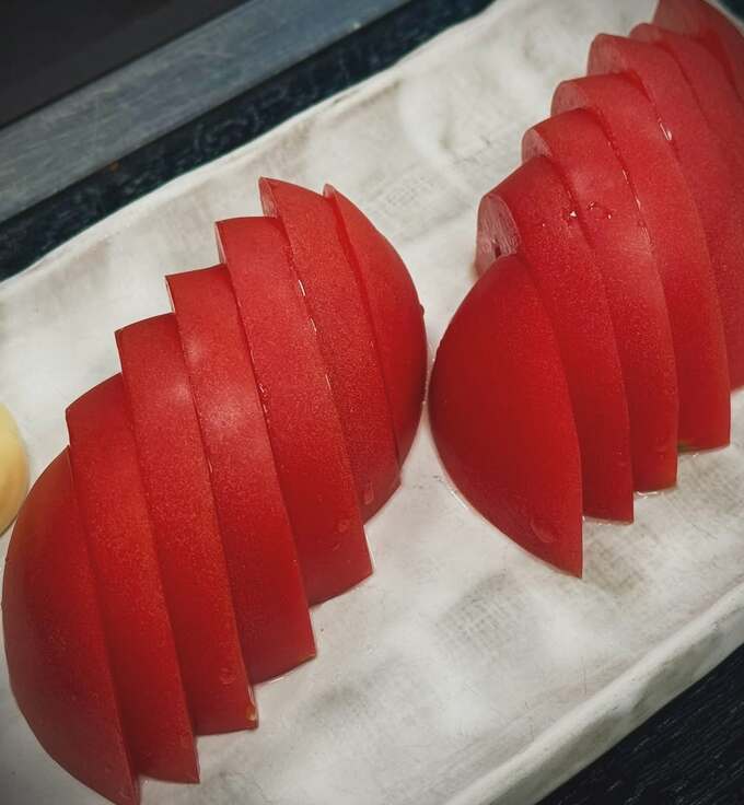 別の写真には、和風の陶器に盛られた一品も紹介されています。薄切りのサーモンが美しく並べられ、中央にはバターが置かれ、かつお節と紅しょうがのもんじゃ。また、鮮やかな赤色のトマトがスライスされて白い長方形の皿に盛られた写真も共有されています。