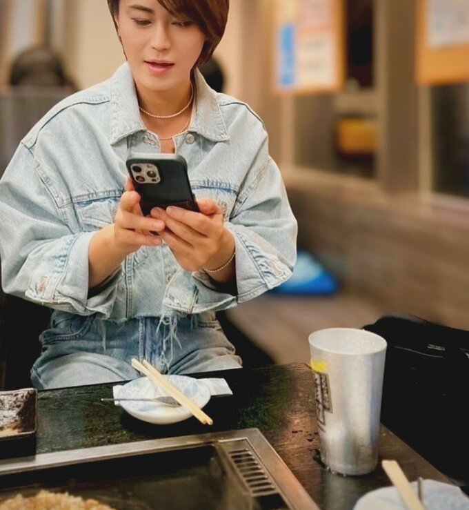また、デニムジャケットとジーンズを着た氷川さんが、鉄板のあるテーブルでスマートフォンを見ている様子も投稿されています。