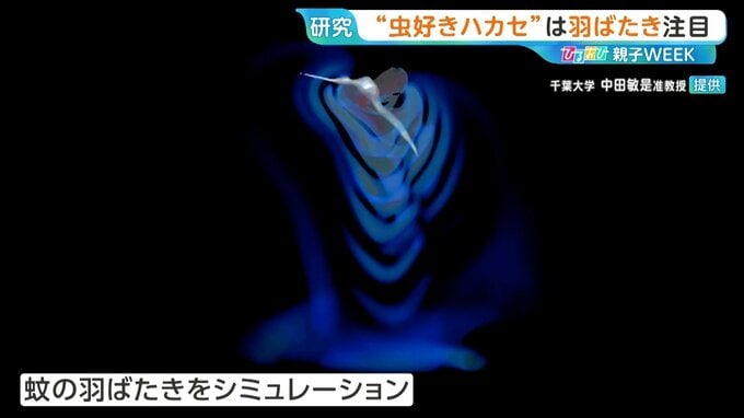 中田敏是准教授による蚊の羽ばたきをシミュレーションした映像では、羽ばたきで発生した気流が床にあたっているのが分かります。