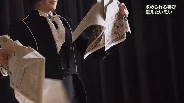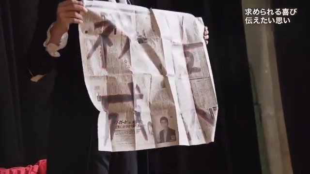 すると・・・破れて何枚にもなっていたはずの新聞紙が一枚の新聞紙に!開いた新聞紙には、文字が書いてありました。その文字は「祝・1/2成人」【画像㉝】。