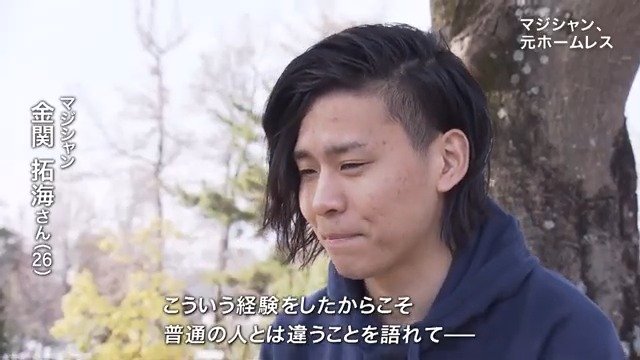 元ホームレス、現マジシャン、金関拓海、26歳。これから先の未来に多くの可能性を秘めながら、言葉とマジックで多くの人たちを励まし続けます。