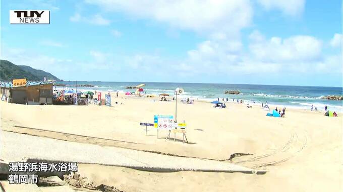 山形県鶴岡市の湯野浜海水浴場は海を楽しむ人たちなどで賑わっています。