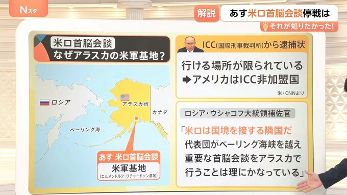 さらに地理的な要因も含まれており、ロシア・ウシャコフ大統領補佐官は「米ロは国境を接する隣国だ。代表団がベーリング海峡を越え、重要な首脳会談をアラスカで行うことは、理にかなっている」と発言しています。