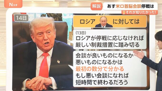 そして、ロシア側に対しては厳しい発言が目立っています。8月13日には「ロシアが停戦に応じなければ、厳しい制裁措置に踏み切る」「会談が良いものになるか、悪いものになるかは、最初の数分でわかる。もし悪い会談になれば、短時間で終わるだろう」とも話しています。