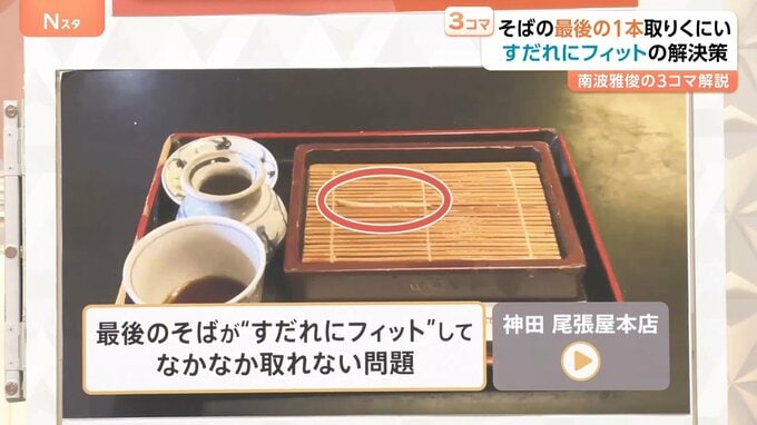 そば店「神田 尾張屋本店」のオーナーに解決策を聞いたところ「箸をすだれに対して垂直に、すだれを少し押すようにすると麺をつまむことができる」ということです。