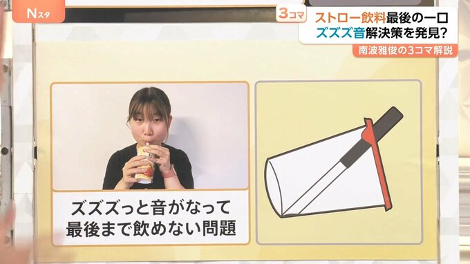 番組スタッフの情報によると、ストローを垂直に入れるのではなく、なるべく端から斜めに入れると、ストローの先端の鋭角な部分がカップの側面にフィットするので「ズズズ」という音を最小限に抑えて飲み切ることができるということです。