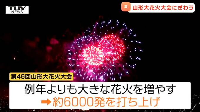 山形市の夏の風物詩山形大花火大会がきのう開かれ、およそ6000発の大輪の花火が夏の夜空を彩りました。