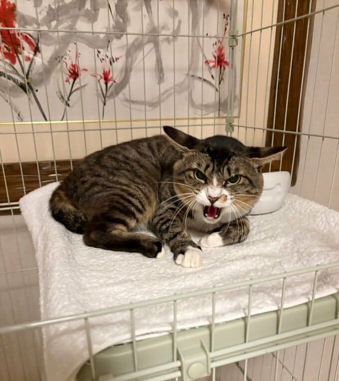 キジトラ模様の「じゃこ天」くんは、ケージに敷かれた白いタオルの上でうずくまり耳を倒した、いわゆる「イカ耳」の状態でレンズに向かって威嚇の表情を見せています。