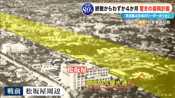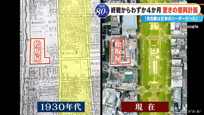 現在の写真と照らし合わせると、元々は民家や学校などが密集していた場所に、久屋大通が作られたことが分かる。