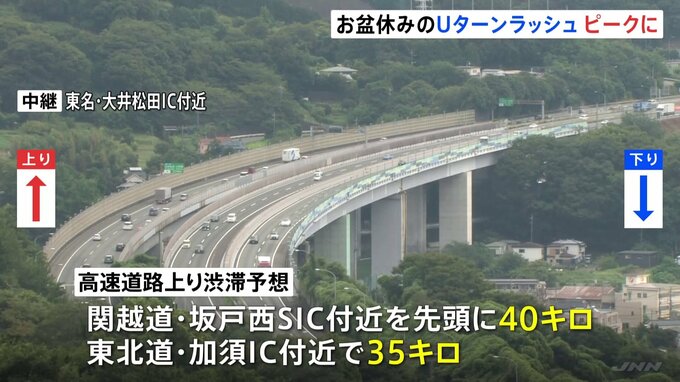 お盆休みのUターンラッシュがピークとなり、高速道路や、鉄道と空の便も混雑しています。高速道路はきょう、上りで渋滞のピークとなり、▼関越道・坂戸西スマートインター付近を先頭に40キロ、▼東北道・加須イン…