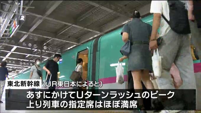 JR東日本によりますと、東北新幹線は8月16日から17日にかけてUターンラッシュのピークを迎え、16日の東京方面に向かう上りは、指定席がほぼすべての列車で満席となっています。