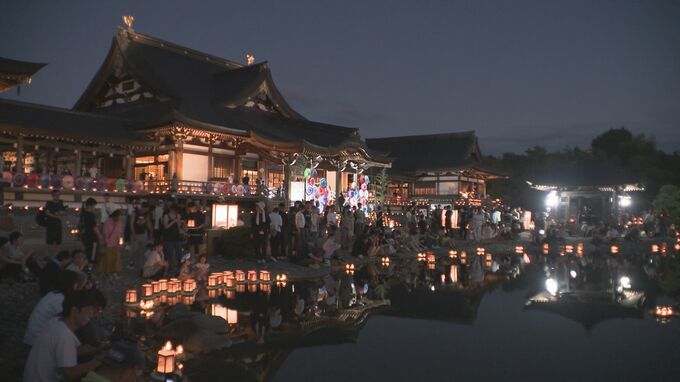 境内にある大心池では灯籠流しもおこなわれ、訪れた人が故人に思いをはせながら200から300個の灯籠を浮かべていました。
