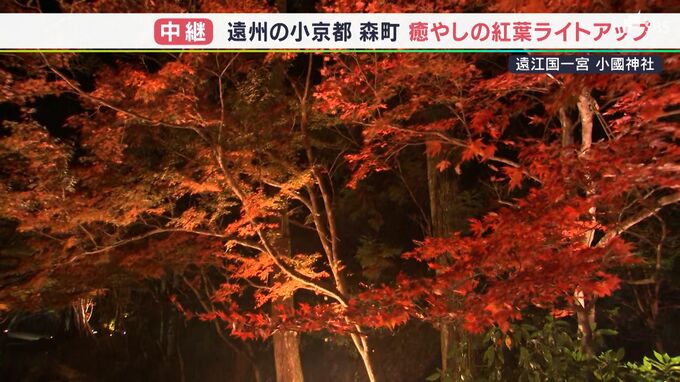 燃えるような赤色に染まったモミジの葉。静岡県森町の小國神社では、通称「宮川」と呼ばれるお宮を流れる川沿いは紅葉観賞の遊歩道となっています。11月19日から紅葉のライトアップを始めたということで、美しくラ…