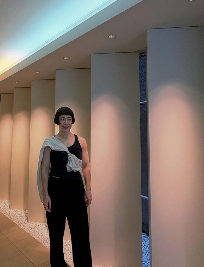 浜口さんは、白い柱の意匠が印象的な場所での写真を投稿。「前髪は整えていただいて、横の髪だけ、とても短くしてもらいました。」とテキストしていて、前髪はいわゆる真っ直ぐの「ぱっつん」に、横の髪は頬骨・耳たぶあたりに届く長さで揃えられていてモードな仕上がりになっています。