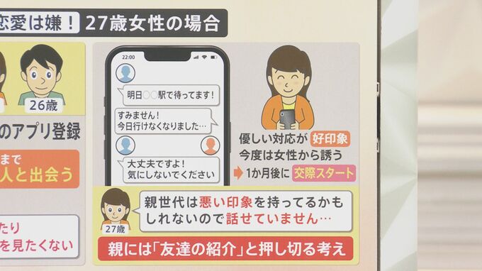 マッチングアプリの出会いを親にはどう伝えているのか。「親世代は悪い印象を持ってるかもしれないので話せていません…」ということで、親には「友達の紹介と押し切ろうかな」という考えをお持ちのようです。
