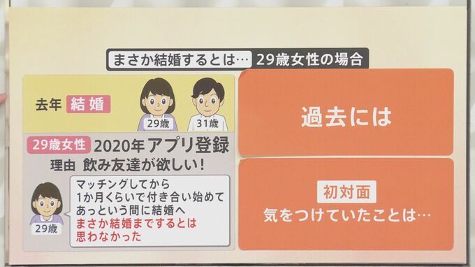 2021年に結婚。夫は31歳。2020年にアプリに登録。その理由は、彼氏が欲しいというより「飲み友達が欲しかった。マッチングしてから1か月くらいで付き合い始めて、あっという間に結婚まで進んだ。まさか結婚までするとは思わなかった」と話していました。過去にはマッチングアプリで、長文を送りつけてくる人がいて、非常に面倒くさいことになりそうだなとか、常に電話がかかってくるようなタイプでしつこくてイヤだったとかいった思いもした。