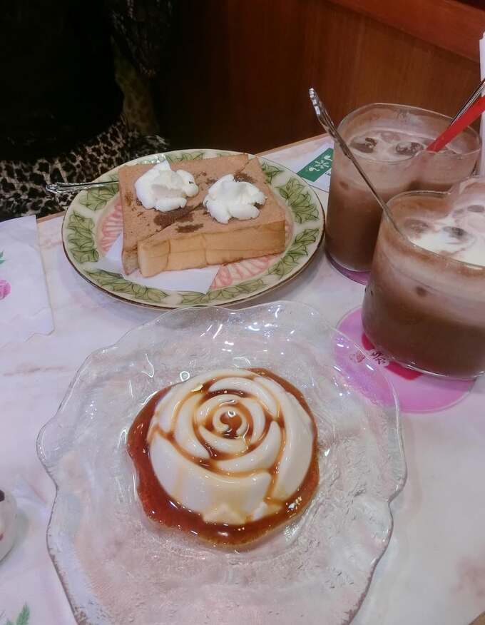 更に、別の写真では美しい薔薇の形をしたスイーツも紹介されています。カラメルソースが芸術的にかかったこのデザートは、見た目も味も楽しませてくれそうです。更にハートの形をしたコップに、ストロー付きのドリンクが2杯、涼しげに並んでいます。