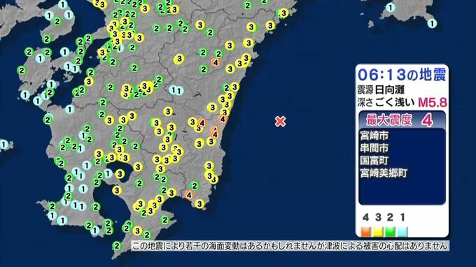 日向灘で17日朝、地震があり、宮崎県内で最大震度4、鹿児島県内でも震度3の揺れを観測しました。