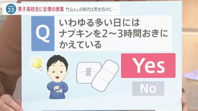 授業では、こんなクイズも出されました。「いわゆる多い日にはナプキンを2~3時間おきにかえている。YESかNOか」というクイズなんですが、竹山さんわかりますか?
