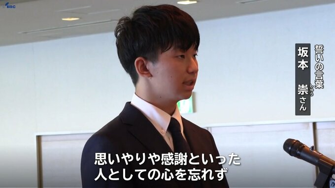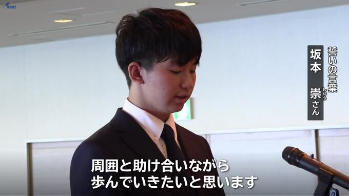 17日の式典には25人の対象者のうち16人が出席しました。佐々木靖村長が「自分の考えをしっかり表現できる人、他の人と共存できる人に成長してほしい」と激励しました。出席者を代表して坂本崇さんが誓いの言葉を述べました。