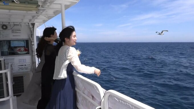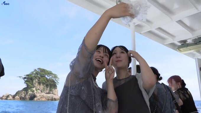 式の後、出席者たちは景勝地の北山崎を巡る観光船に乗り込みカモメにエサを与えたり写真を撮ったりしながら久しぶりに会った同級生と楽しい時間を過ごしていました。