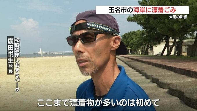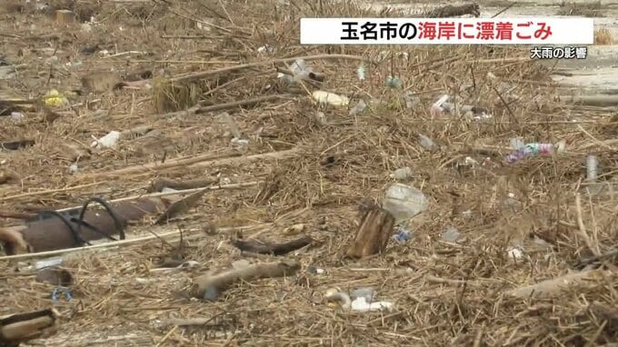 熊本県玉名市の海岸に、大雨で流出した大量のごみが漂着しています。