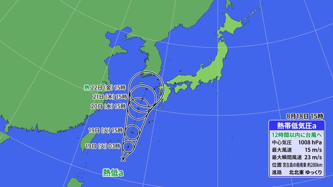 沖縄の南に発生した熱帯低気圧は、今後12時間以内に、台風になる見込みです。この後、比較的ゆっくりとした速度で北上し、沖縄や奄美地方に近づくおそれがあります。