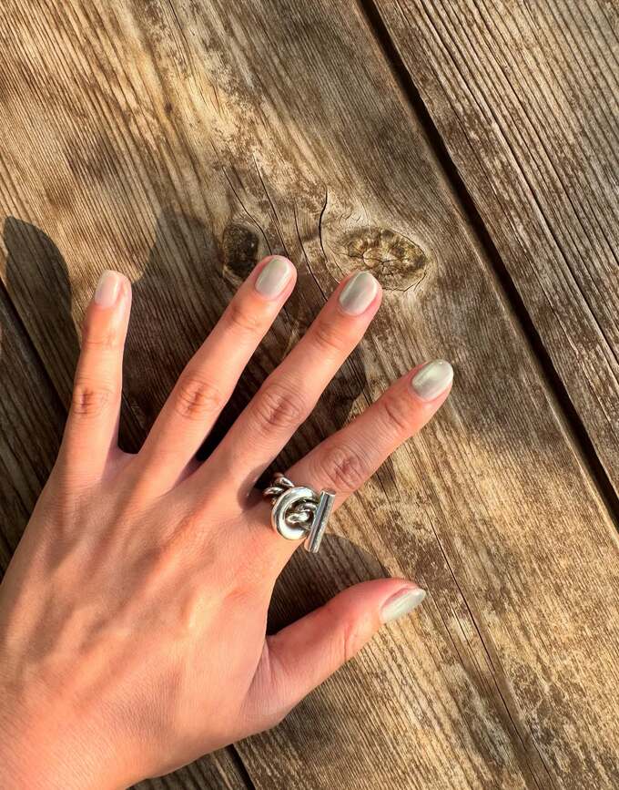 投稿された写真では、原さんが右手を顔の前に掲げ、微笑んでいる姿が写っています。手元のショットでは、木製のテーブルに置かれた手に、シンプルなシルバーネイルが施されているのが確認できます。特に人差し指にはモダンでユニークなデザインの大きなシルバーリングが存在感を放っています。