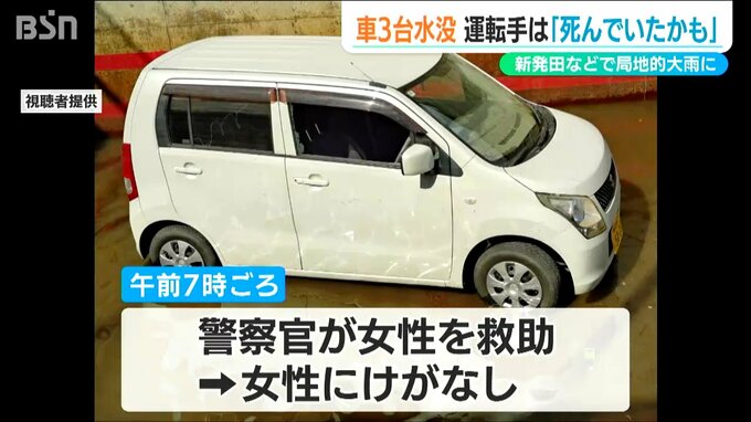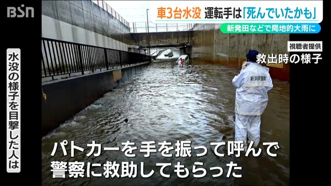 「冠水している状態なんで、(車は)戻ってくるかなと思ったんですけど、そのままジャボンと。おばあちゃんというか女性だったんで、パトカーを手を振って呼んで救助してもらった」