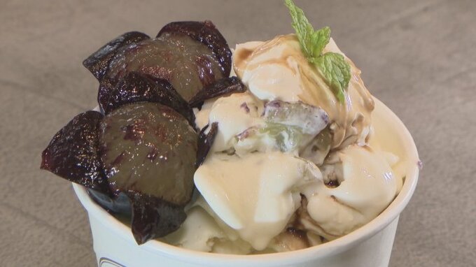 大粒ブドウの藤稔をアイスクリームに添え、味の決め手はバルサミコ酢とマスカルポーネチーズです。