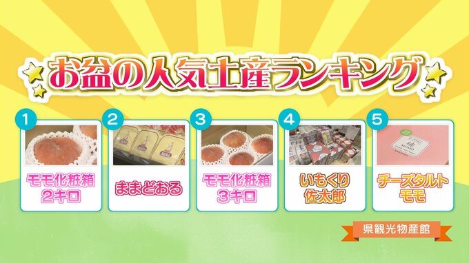 【福島の人気おみやげランキング】4位「いもくり佐太郎」2位「ままどおる」1位は… テレビユー福島 2025年8月18日(月) 16:45 国内 2位は「ままどおる」1位は… 2位は、福島の定番みやげ、三万石の「ままどおる」でした。 そして、1位は「モモの化粧箱2キロ」です。やはり、フルーツ王国・ふくしまのモモが堂々の1位ということになりました。 みなさんも、福島の味を贈ってみませんか?