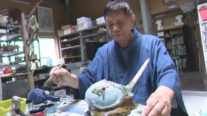 「白備前」で知られる備前焼作家・木村玉舟さんの新たな挑戦です。普段製作している作品は伝統的な乳白色。今回はデニムの染料を用いたユニークな生きものたちです。焼き物に、青い染料を塗っていきます。(前田唯…