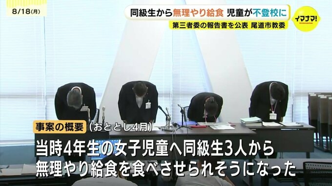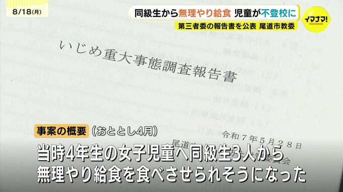 報告書によりますと、おととし4月、当時4年生の女子児童が、給食中に同級生3人から無理やり食べさせられそうになったことで、不登校につながったということです。