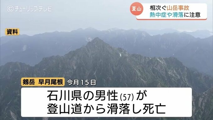 一方で、夏山の登山中の死亡事故が相次いでいます。今月15日、石川県の57歳の男性が北アルプスの剱岳・早月尾根の標高およそ2670メートル地点で登山道から滑落し死亡。同じく15日、鳶山では、単独での登山をしていた神奈川県の63歳の男性が滑落。救助されましたがその後、死亡が確認されました。