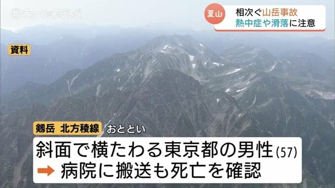 さらに翌16日には、剱岳の北方稜線の斜面に東京都の57歳の男性が横たわっているのが見つかり、病院に搬送されましたが死亡が確認されました。
