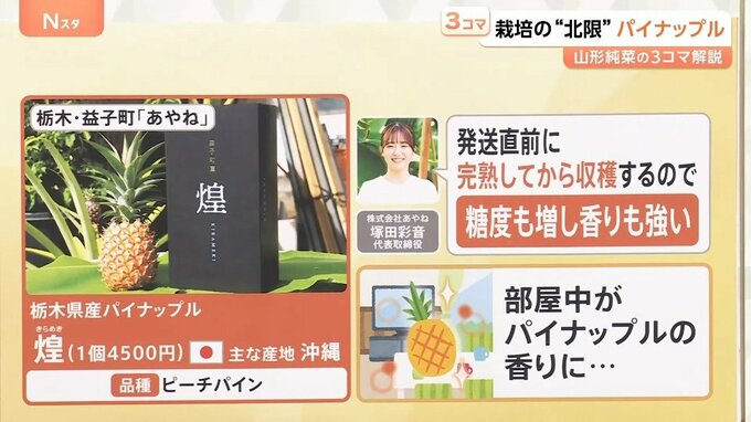 株式会社あやねの塚田彩音代表取締役は「発送直前に完熟してから収穫するので、糖度も増し香りも強い」と話していて、「煌」があると部屋中がパイナップルの香りになるそう。