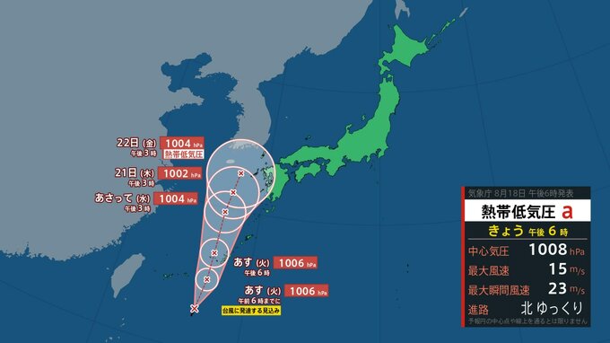 18日15時の観測によると、熱帯低気圧が宮古島の南南東約280キロにあって、ゆっくりした速さで北北東へ進んでいます。中心の気圧は1008ヘクトパスカル、中心付近の最大風速は15メートル、最大瞬間風速は23メートルとなっています。熱帯低気圧は今後12時間以内に台風となる見込みで、19日にかけて沖縄地方に接近し、その後、東シナ海を北上するでしょう。