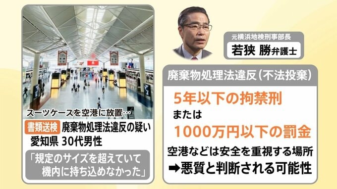 元横浜地検刑事部長・若狭勝弁護士は「廃棄物処理法違反(不法投棄)は、5年以下の拘禁刑、または1000万円以下の罰金となる。空港やホテルなどに放置すると、安全を重視する場所なので、悪質と判断される可能性がある」といいます。