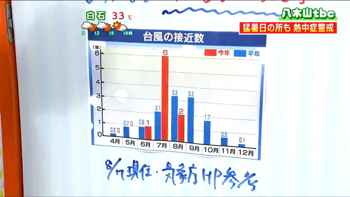 番組では台風の接近数に関する統計情報も紹介されました。グラフでは青色が平年の接近数、赤色が今年の接近数を示しています。