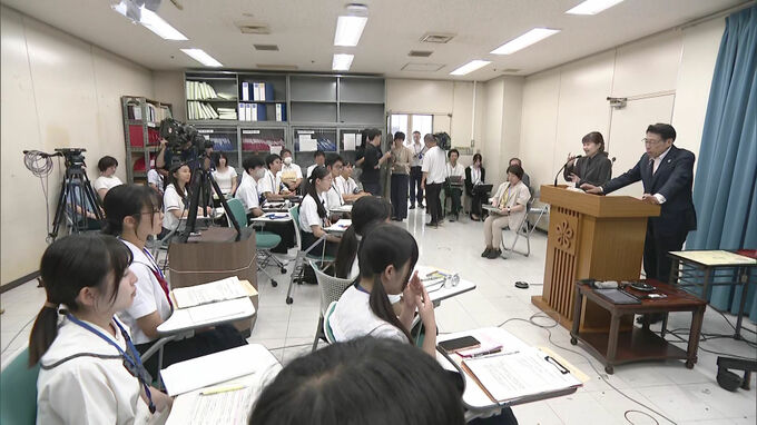 19日午前、福岡県庁で開かれた服部知事の会見には、県内8つの高校の新聞部に所属する生徒13人が参加しました。
