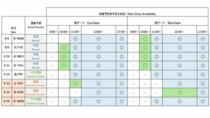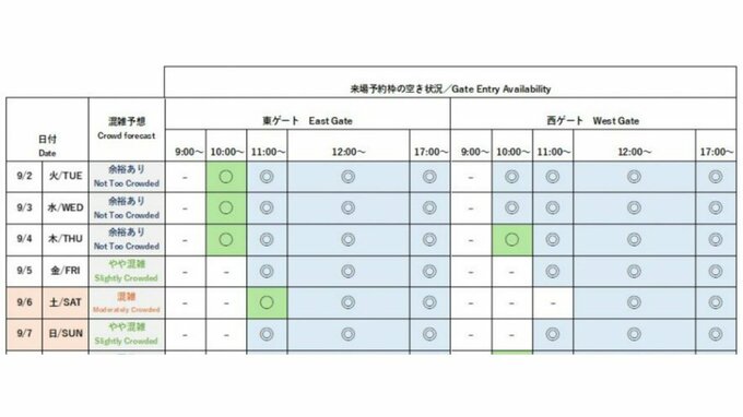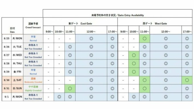「やや混雑」は、8月24日と31日の日曜日。24日は東西ゲートとも午前中の枠無しです。31日は東西ゲートとも午前10時台までの入場枠無しです。