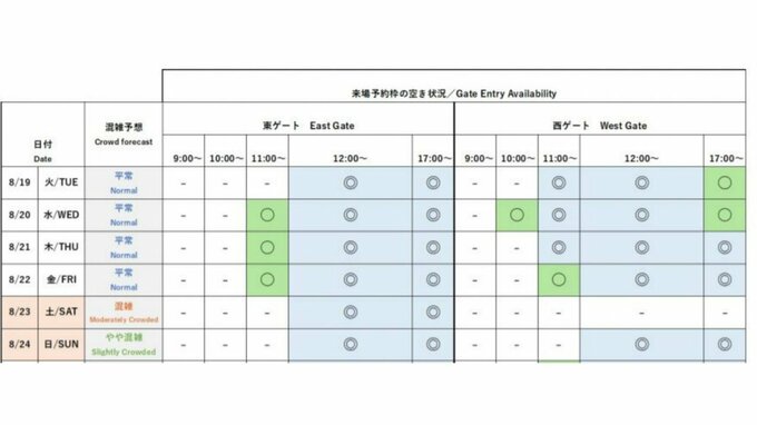 まず「混雑」と予想されているのが、8月23日と30日の土曜日です。23日は東ゲートは午前中枠無し。西ゲートはなんと夕方含むすべての時間で枠無しです。