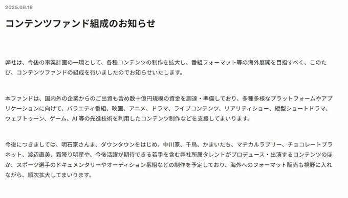 公式サイトでは「今後の事業計画の一環として、各種コンテンツの制作を拡大し、番組フォーマット等の海外展開を目指すべく、このたび、コンテンツファンドの組成を行いましたのでお知らせいたします。」と公表しました。