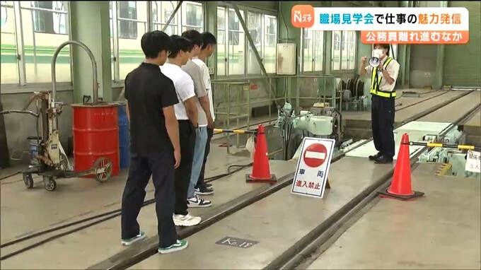 公務員を志望する人が、全国的に減るなか、仕事のやりがいや魅力を伝えようと仙台市役所の職場見学会が、19日から始まりました。仙台市交通局の富沢車両基地で行われた職場見学会には、機械職や電気職を希望する高…